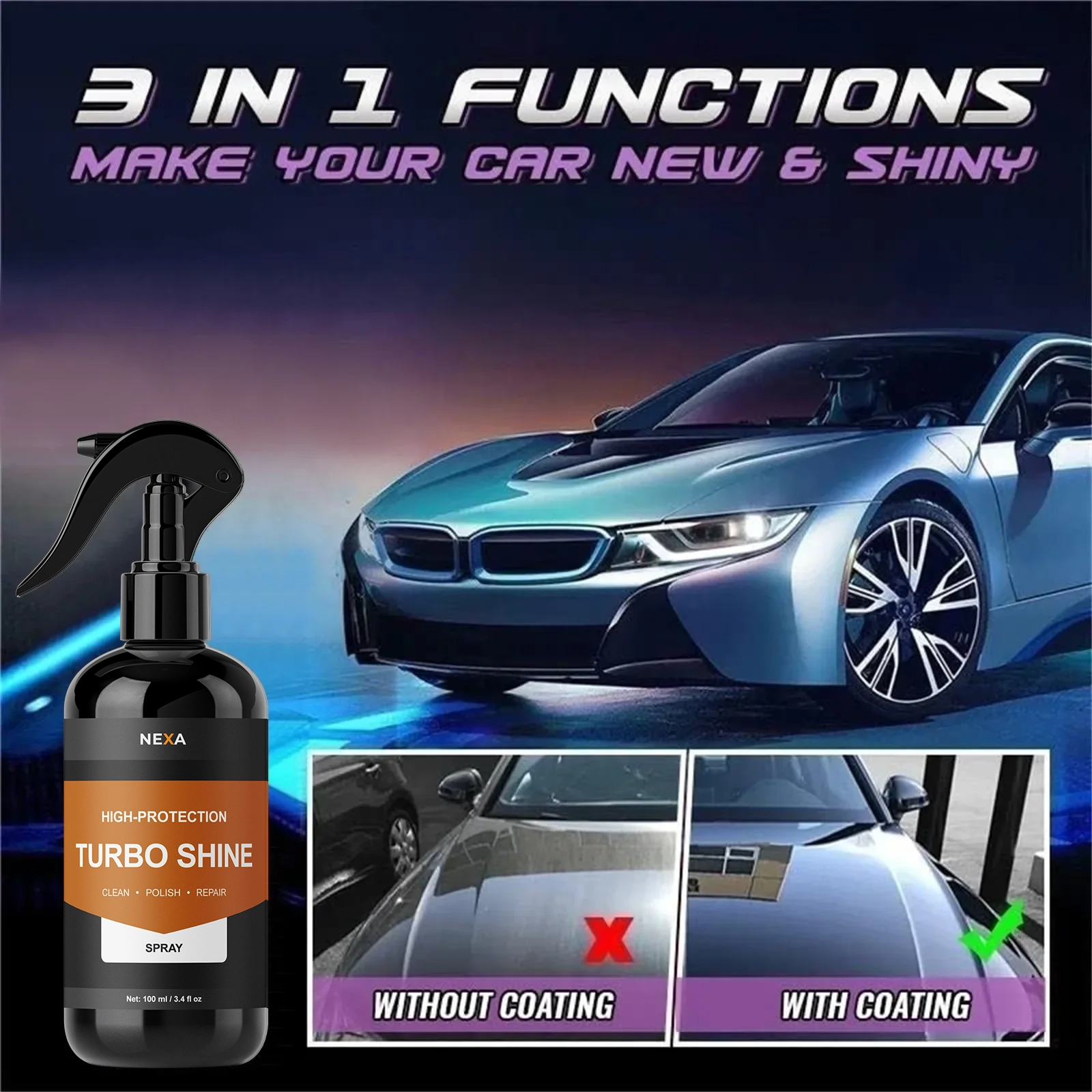 TurboShine™ instantly cleans and restores any vehicle surface, removes scratches and abrasions, creates long-lasting protection against water, dirt, UV rays, oxidation and rust
